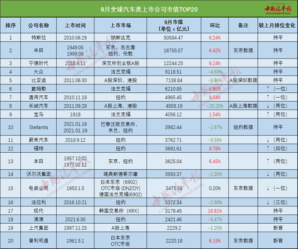 9月,特斯拉、豐田和大眾集團依然是國際車企市值圈的“三巨頭”。