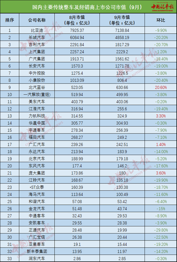 9月國內主要傳統整車及經銷商上市公司市值前五名的公司中,比亞迪依然占據首位,市值達到7138.84億元,雖環比下滑9.9%,但仍比居其后者多出2280億元。比亞迪9月整車銷量保持了較大幅度增長。10月3日,比亞迪發布的9月產銷快報顯示,9月比亞迪全系乘用車銷售79037輛,同比增長93.2%;其中新能源乘用車銷量就達70022輛,同比增長276.4%。