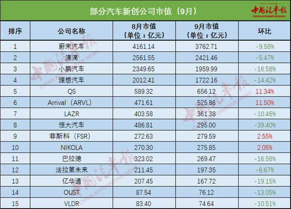 在造車新勢力陣營,除了特斯拉市值依舊“獨領風騷”之外,中國的造車新勢力頭部陣營的“蔚小理”在9月出現了市值集體下跌的情況。其中,蔚來汽車9月市值環比下跌9.58%,小鵬汽車下跌16.58%,理想汽車下跌14.42%。