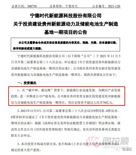 寧德時代發布公告顯示,擬在貴州省貴安新區投資建設貴州新能源動力及儲能電池生產制造基地一期項目,項目總投資不超過70億元。