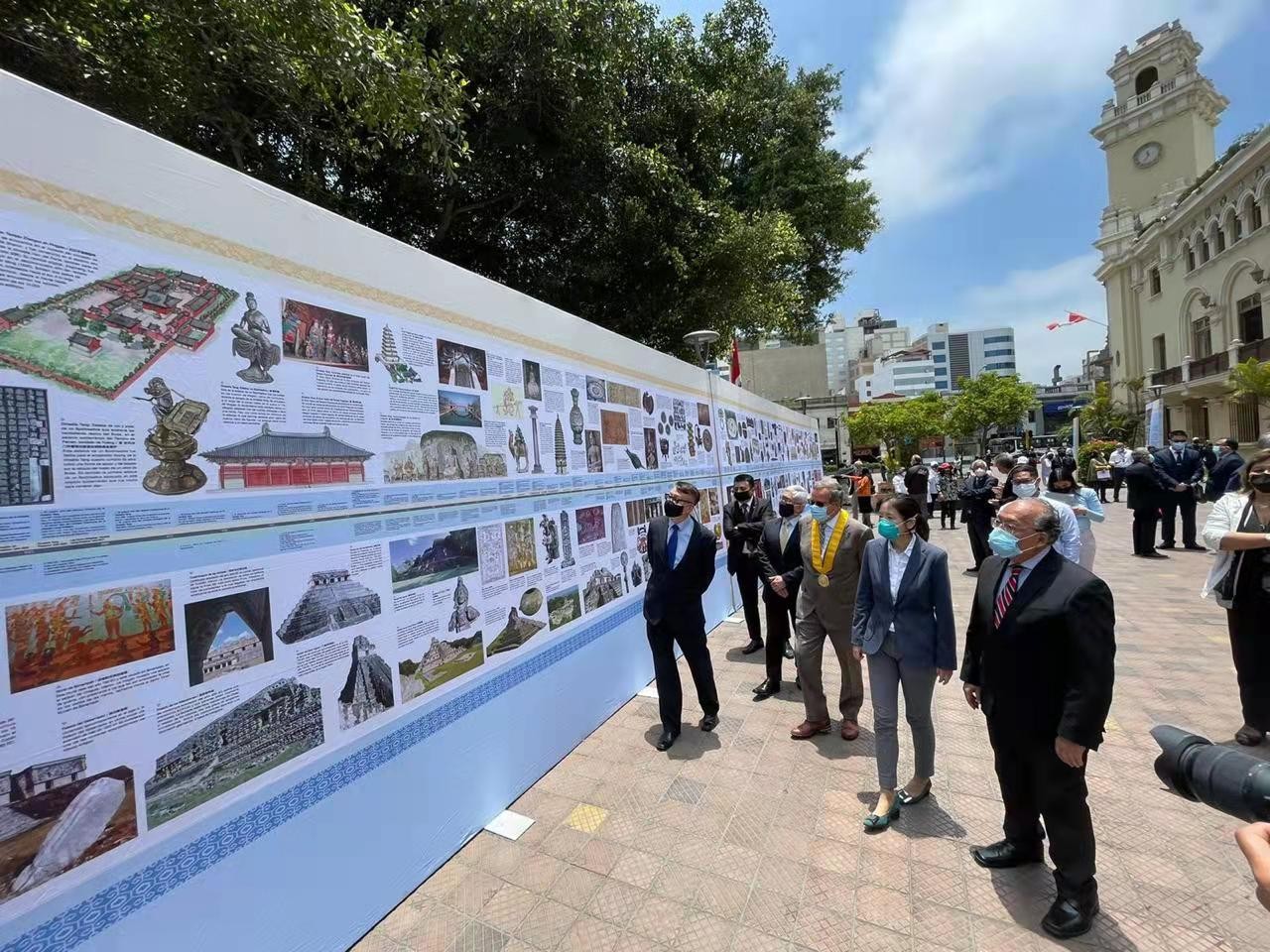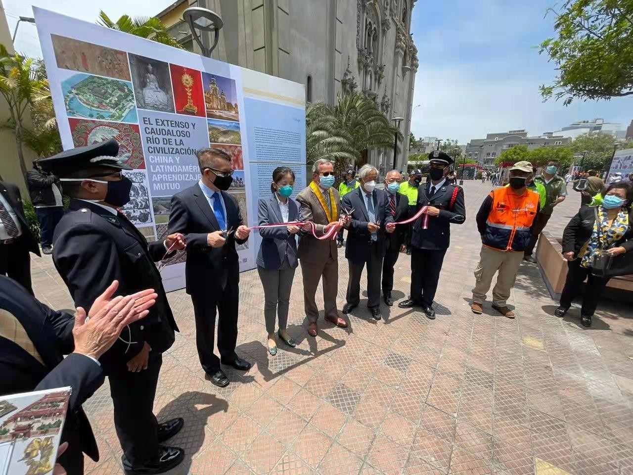 2021年11月4日,由中國長江三峽集團有限公司、秘中文化中心、《今日中國》雜志聯合主辦的《文明的長河——中拉文明互鑒》展再次回到秘魯首都利馬,在Miraflores 市政廣場前開幕,并舉行了剪彩儀式。秘中文化中心主席陳路、副主席戴國威、今日中國雜志秘魯代表處負責人孟可心、秘魯前衛生部長楊莫塔等出席了剪彩儀式。