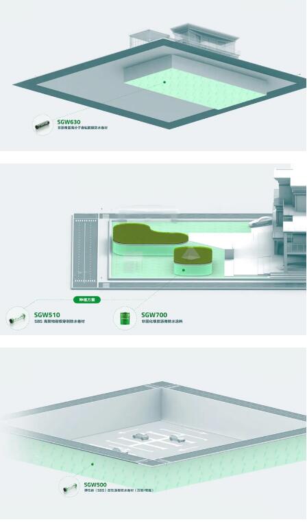 地下空間防水工程為隱蔽工程,作為城市建筑大型化,高層化與充分利用地下空間的結果,其防水工程質量與建筑物整體結構安全,延長使用壽命有直接關系。該項目中,為降低地下空間建成后出現防水失效、滲漏水等情況出現,三棵樹防水以SGW630非瀝青基高分子自粘膠膜防水卷材為建筑地下室底板筑起牢固的附加防水層;側墻使用SGW500彈性體(SBS)改性瀝青防水卷材;頂板采用SGW700非固化橡膠瀝青防水涂料與SGW510高聚物耐根穿刺瀝青防水卷材兩種同為瀝青基材質材料令防水層一次成型,實現基層滿粘。全方位保護項目地下空間免受滲漏水煩惱。