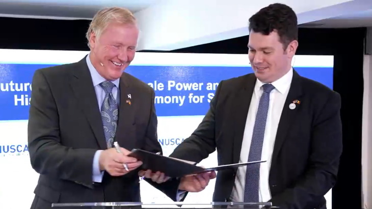 NuScale公司首席執(zhí)行官約翰·霍普金斯(John Hopkins,左)和Nuclearelectrica公司首席執(zhí)行官科斯明·吉塔(Cosmin Ghita,右)簽署合作協(xié)議。