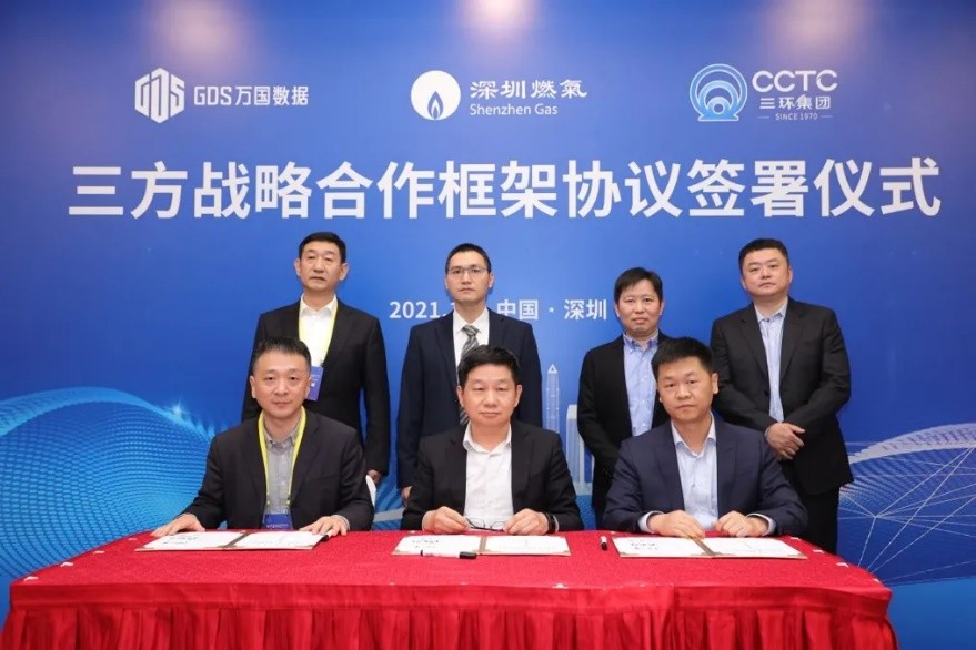 萬國數(shù)據(jù)高級副總裁陳江平(左)、深圳燃氣副總裁榮光新(中)、三環(huán)集團總裁劉杰鵬(右)