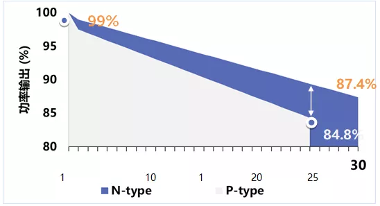 晶科能源Tiger Neo系列N型組件以其出色的光衰性能(首年衰減小于1%,線性衰減小于0.4%),贏得了業界廣泛關注。基于實驗室條件,剛經生產完畢的N型電池及組件都有“零衰減”甚至是“負衰減”等特性,以上晶科的數據針對N型TOPCon測試為-0.1%LID及-0.3%LeTID也佐證了這個理論。但由于外部環境以及材料的老化,在實際的外部環境下,功率衰減會相應升高,這也解釋了為什么部分廠家使用“零光衰“的說法,但同時只堅持首年質保維持在1%而非0%。除了更優的首年衰減外,晶科TigerNeo系列組件的線性衰減也十分出色。組件線性衰減控制在小于0.4%/年的范圍內,在長達30年的生命周期里,Tiger Neo系列N型組件對比常規P型組件,最終功率輸出能從84.8%提升至87.4%,為整個光伏系統帶來更高的發電量輸出,實現LCOE成本的大幅下降。