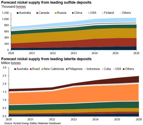睿咨得能源(Rystad Energy)預計,硫化鎳的供應不會增長太快,不足以避免全球鎳供應短缺,因為較老的硫化鎳礦關停速度比新礦的發現速度要快。鎳價上漲可能會讓之前不具經濟效益的項目變得可行,如加拿大的Dumont項目,也可能刺激鎳礦商增加電池鎳勘探支出。然而,開發任何新的供應來源都需要數年時間,無法解決短期供應問題。