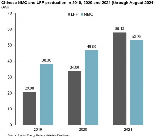圖3:2019年、2020年和2021年前8個月中國NMC和LFP電池產量