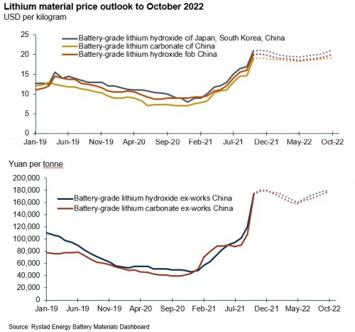 睿咨得能源的月度價格指數顯示,10月初,中國碳酸鋰進口價格約為19美元左右/千克,較2021年9月上漲了30%,與2020年10月相比上漲了171%。本月初,電池級氫氧化鋰中日韓到岸價大約21美元/千克,較上月上漲24%,較上年同期上漲133%。
