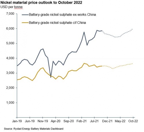 由于動力電池行業對硫酸鎳需求增加,睿咨得能源的價格指數顯示,10月中國電池級硫酸鎳的出廠價格為3.8萬元/噸,較上月上漲0.8%。