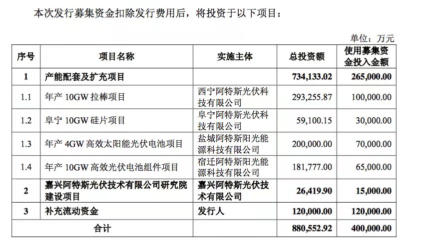 本次科創(chuàng)板過(guò)會(huì),阿特斯將募集40億元分別用于年產(chǎn)10GW拉棒項(xiàng)目、阜寧10GW硅片項(xiàng)目、年產(chǎn)4GW高效太陽(yáng)能電池項(xiàng)目、年產(chǎn)10GW高效光伏電池組件項(xiàng)目,以及嘉興阿特斯技術(shù)研究院的建設(shè)和流動(dòng)資金補(bǔ)充。