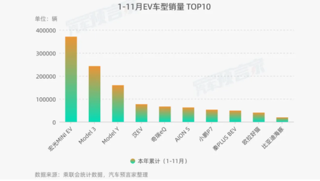 2021年1-11月中,共有三款純電動車型累計銷量超過了10萬輛,分別為宏光MINI EV、Model 3和Model Y。