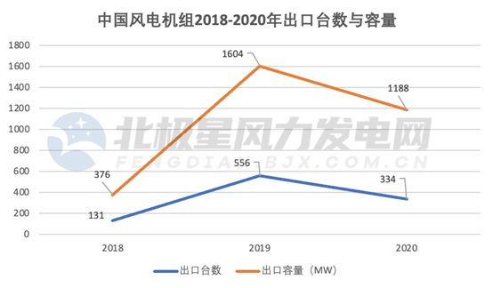 中國風電機組出口起于2007年,首次由華儀風能向智利出口了3臺780kW的風電機組,此后十多年間,我國風電陸續保持不高的出口數量,到2011年開始突破百兆瓦。2018年至2020年,我國出口風機臺數分別為131臺、556臺、334臺,對應的容量分別為376MW、1604.6MW、1188MW。