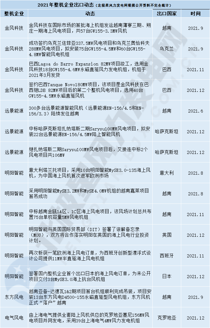 2021年國內風電整機商海外市場動態