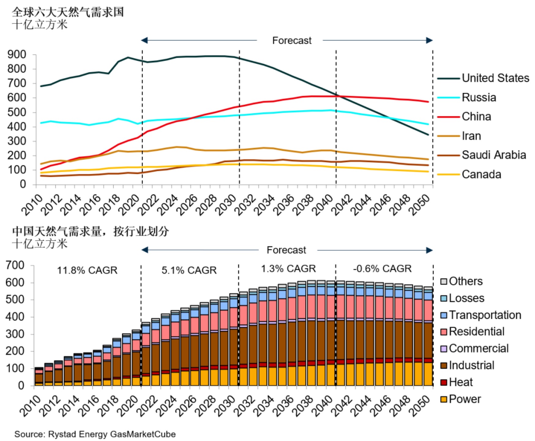 為了實現2060年碳中和目標,隨著可再生能源在中國能源結構中的占比越來越大,睿咨得能源(Rystad Energy)預計,2030-2040年中國天然氣需求年均復合增長率將放緩至1.3%。隨著從2030年起美國的化石燃料需求將以更快的速度下降,預計中國將在2040年代初超過美國,成為全球最大的天然氣消費國。
