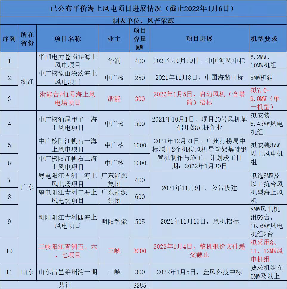 風芒能源獲悉,近日,已經有3.3GW海上風機啟動招標:1月4日,三峽陽江青洲五、六、七海上風電項目共計3GW整機商報價文件遞交截止。1月5日,浙能臺州1號海上風電場項目300MW風電機組及附屬設備啟動招標。