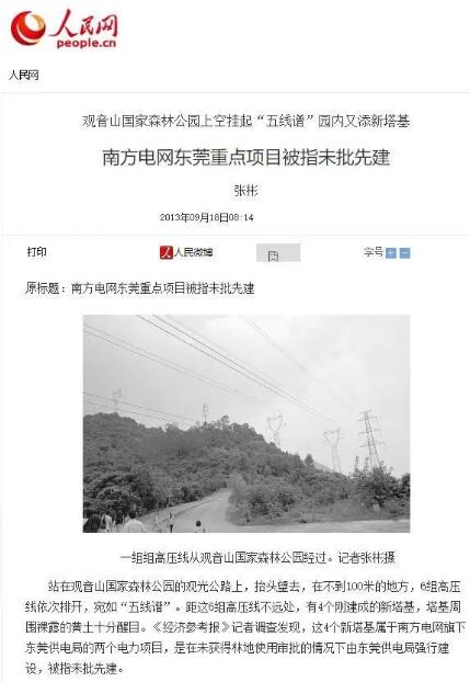 之前有人民網轉發《經濟參考報》報道,“南方電網東莞重點項目未批先建,強制架設高壓線”,因高壓線路架建將直接影響到公園景觀,并擔心施工可能會導致山體松動造成水土流失,易形成山體塌方,架建工程一度曾遭到觀音山方面的強烈反對。