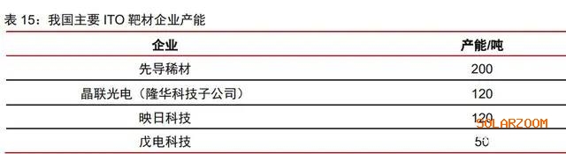 靶材是 TCO 薄膜沉積的關鍵,ITO 靶材為最佳選擇。不論是 PVD 工藝還是RPD工藝,靶材都是必不可少的材料。目前市場化的靶材有 AZO 和 ITO 等。AZO材料價格較為經濟,但其導電性較 ITO 相差較大,通過厚鍍膜來彌補導電性將極度降低光的透過率,將 大幅降低電池特性。ITO靶材就是氧化銦和氧化錫粉末按一定比例混合后經過一系列的生 產工藝加工成型,再高溫氣氛燒結(1600度,通氧氣燒結)形成的黑灰色陶瓷半導體,通過 調整氧化銦和氧化錫粉末的比例,可以提高 HJT 電池的轉換效率。