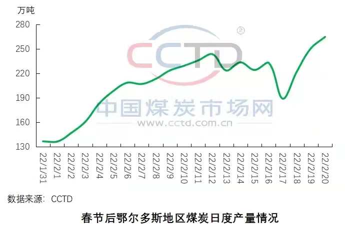 產(chǎn)地煤炭供應(yīng)穩(wěn)步增加。近期,產(chǎn)地煤礦復(fù)工復(fù)產(chǎn)進(jìn)程加快,在產(chǎn)煤礦產(chǎn)量逐步增加,根據(jù)CCTD中國(guó)煤炭市場(chǎng)網(wǎng)監(jiān)測(cè)的數(shù)據(jù)顯示,截至目前,鄂爾多斯地區(qū)在產(chǎn)煤礦數(shù)量已提升至225座,較春節(jié)期間增加42座,區(qū)域內(nèi)煤炭日產(chǎn)量已超過(guò)260萬(wàn)噸/日,較春節(jié)期間最低點(diǎn)增長(zhǎng)超90%。