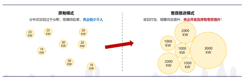 央企與新玩家的不斷加入,使原本就在分布式市場領(lǐng)域的不少民企感受到了危機(jī)。由于分布式光伏單體規(guī)模小、碎片化、難管理等特點,一直以來都是民企的主戰(zhàn)場,央企并不愿意介入。但整縣推進(jìn)以后,把原本分散的資產(chǎn),進(jìn)行了打包集中開發(fā),商業(yè)模式得到了優(yōu)化,疊加央國企較高的新能源裝機(jī)任務(wù),分布式光伏搖身一變成為央國企的“寵兒”。