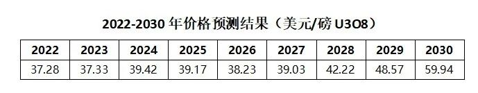 報(bào)告還對(duì)2022-2030年天然鈾現(xiàn)貨價(jià)格作了預(yù)測(cè)。之所以選擇對(duì)長(zhǎng)期現(xiàn)貨價(jià)格進(jìn)行預(yù)測(cè),是因?yàn)樵搩r(jià)格是反應(yīng)市場(chǎng)供需關(guān)系的主要指標(biāo),是長(zhǎng)貿(mào)協(xié)議引用的重要指數(shù),且不易受到短期市場(chǎng)投機(jī)行為的影響。