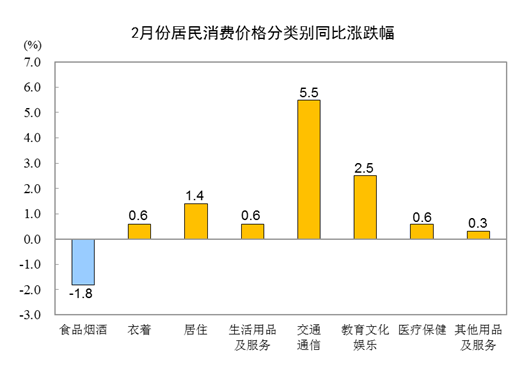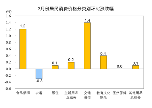 2月份,全國居民消費價格環(huán)比上漲0.6%。其中,城市上漲0.6%,農(nóng)村上漲0.6%;食品價格上漲1.4%,非食品價格上漲0.4%;消費品價格上漲1.0%,服務(wù)價格持平。