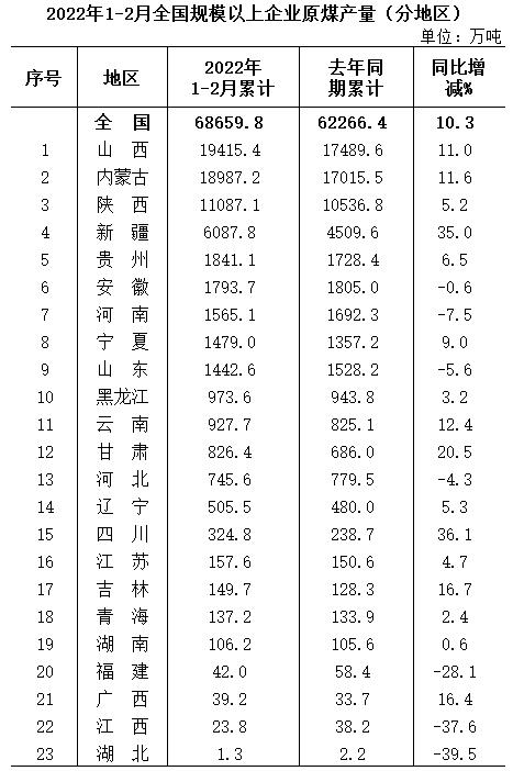 國(guó)家統(tǒng)計(jì)局?jǐn)?shù)據(jù)顯示,1-2月全國(guó)原煤產(chǎn)量68659.6萬(wàn)噸,同比增長(zhǎng)10.3%。