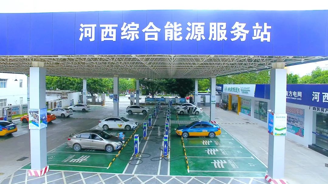 ▲ 在廣西柳州,河西綜合能源服務站內的充電設施擁有先進的柔性直流充電技術,根據不同的車輛需求自動分配所需的充電功率,實現功率柔性分配,大幅提升充電功率及設備利用率,解決傳統一體式直流充電機占地、噪音、散熱等難題。
