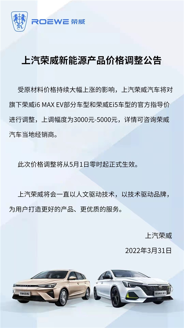 3月31日,榮威品牌官方宣布:受原材料價格持續大幅上漲的影響,上汽榮威汽車將于5月1日零時起,對旗下榮威i6 MAX EV部分車型和榮威Ei5車型的官方指導價進行調整,價格上調3000-5000元。