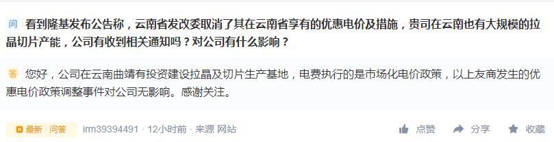 中環股份在接受媒體采訪時表示,云南取消隆基優惠電價對公司沒有什么影響;而通威股份在接受媒體提問時則回應稱,“我們沒有收到相關的通知”。