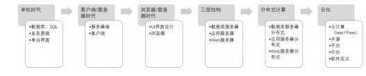 由賽迪CCID提供的分析表可以看出:由國內單一公司全面替代SAS,在技術層面有一定難度,但隨著軟件開發技術架構的演變,可由多家拆解開發、依托中臺技術云化實現SAS功能。如下圖所示:軟件開發技術架構從單機時代發展到如今的分布式時代、云化時代,軟件定義“一切”,軟件業云化、平臺化、中臺技術、服務化發展趨勢凸顯,軟件產品和服務向基于云計算方向發展。