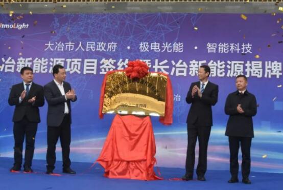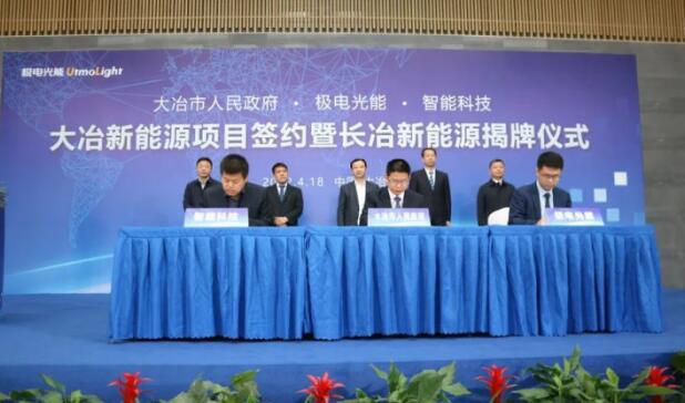 4月18日,極電光能與大冶市人民政府、智能科技在湖北大冶舉行“大冶新能源項目簽約暨長冶新能源揭牌儀式”。大冶新能源項目裝機規模達2.8GW,總投資金額約120億元。