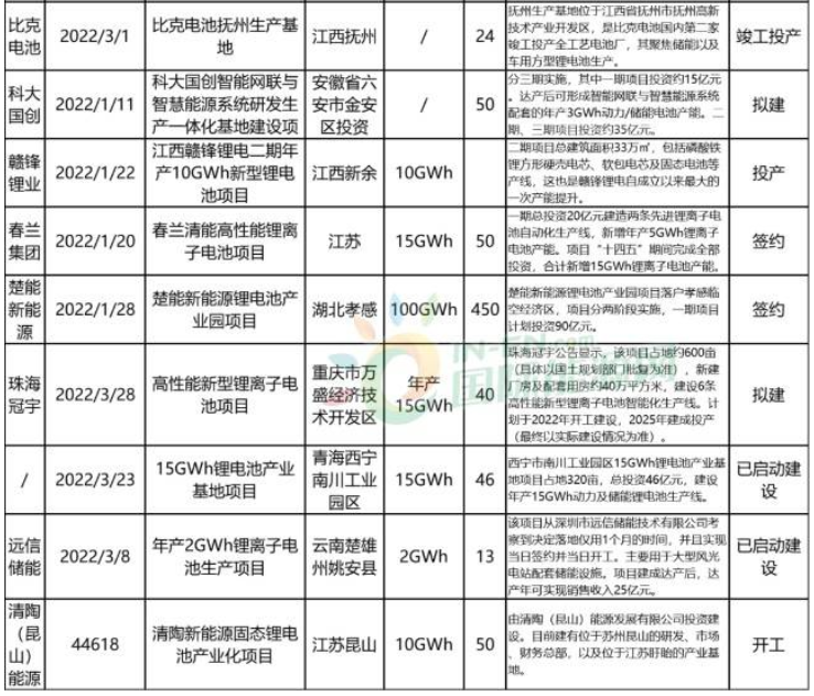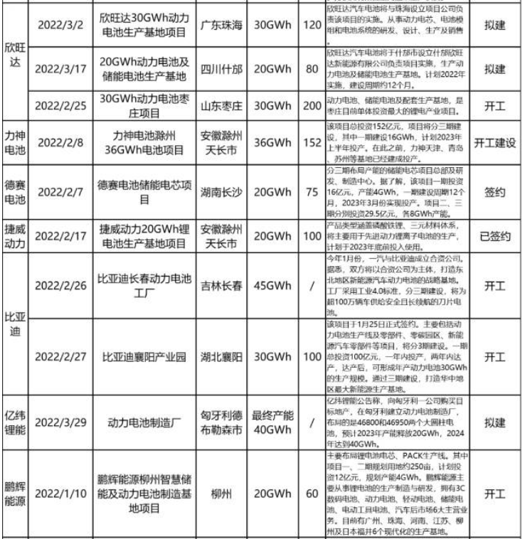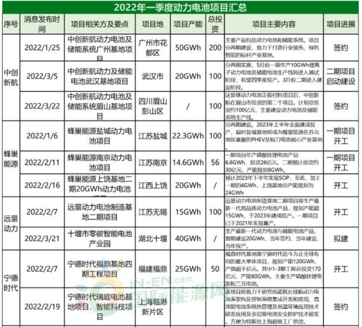 2022年一季度動力電池項目匯總表