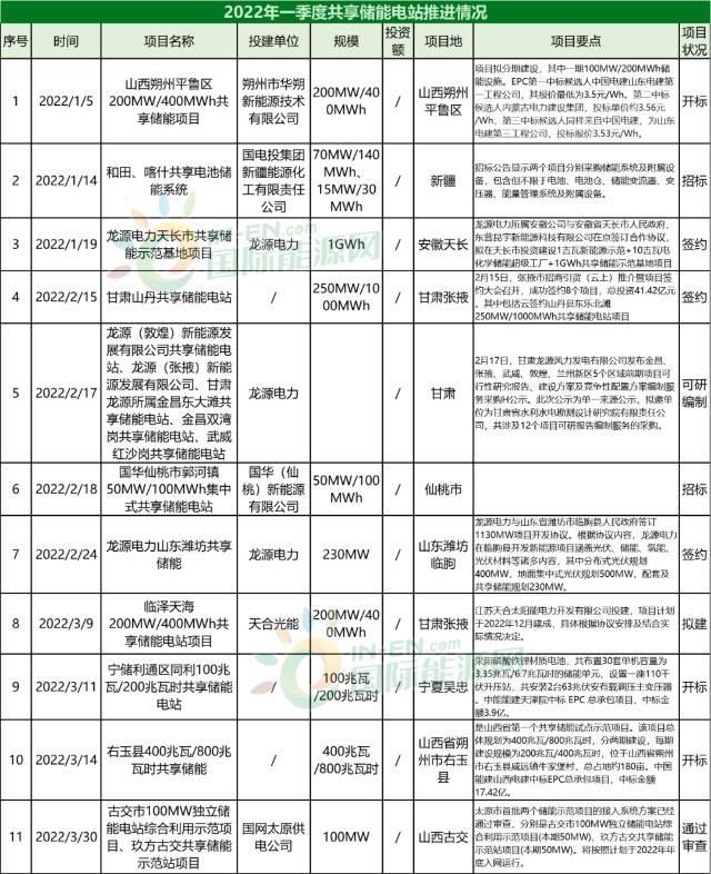 2022年一季度共享儲能電站推進(jìn)情況表