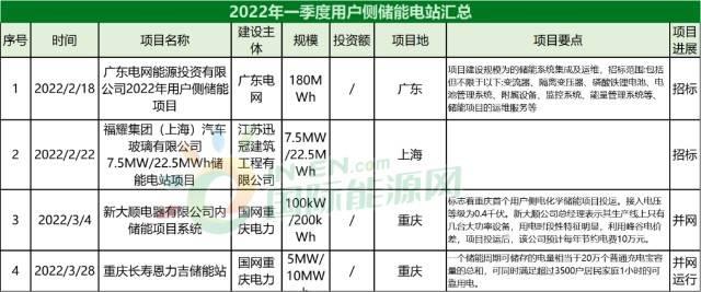 2022年一季度用戶側(cè)儲能電站匯總表