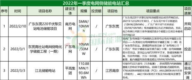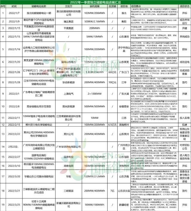 2022年一季度電網(wǎng)側(cè)儲能電站匯總表