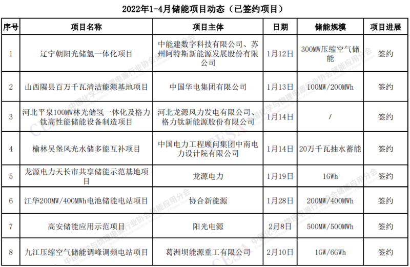 據中國化學與物理電源行業協會儲能應用分會產業政策研究中心不完全統計,2022年1-4月以來,主要儲能項目簽約達20個,規模超10GWh。簽約項目類別包括:壓縮空氣儲能、電化學儲能、抽水蓄能、氫儲能等。