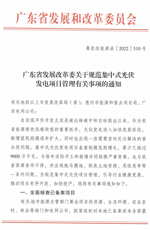 廣東發改委發布《關于規范集中式光伏發電項目管理有關事項的通知》,全面整頓全省光伏。