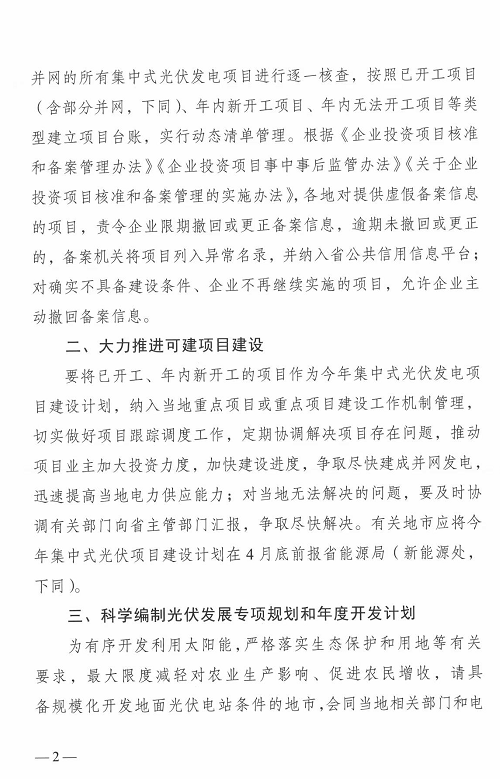 2.大力推進可建項目建設:要將已開工、年內新開工的項目作為今年集中式光伏發電項目建設計劃,納入當地重點項目或重點項目建設工作機制管理,