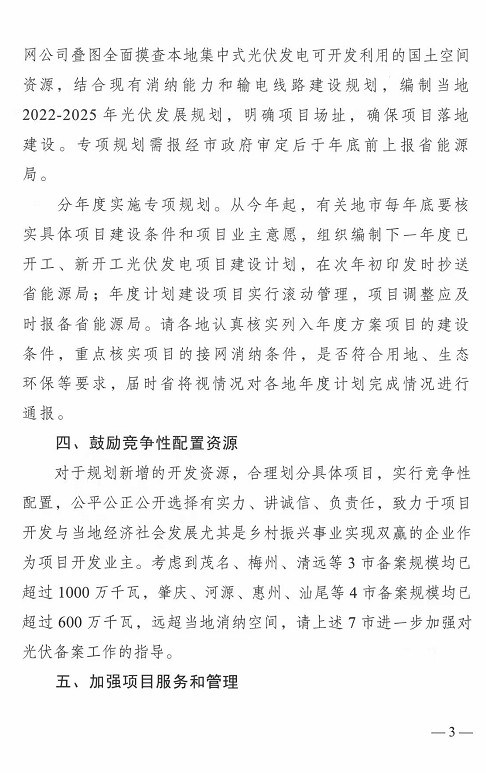 4.鼓勵競爭性配置資源:考慮到茂名、梅州、清遠等3市備案規模均已超過1000萬千瓦,肇慶、河源、惠州、汕尾等4市備案規模均已超過600萬千瓦,遠超當地消納空間,請上述7市進一步加強對光伏備案工作的指導。