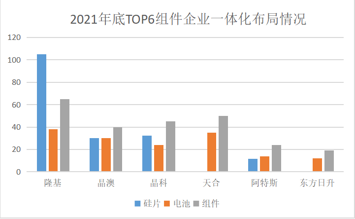 近兩年供應鏈分享的持續加劇使得組件企業一體化的決心與日俱增,在去年組件企業呈壓的狀態下,各頭部組件企業均有一體化布局,包括隆基、晶澳、晶科、天合、阿特斯、東方日升等。從以下的表格可以看出,與2020年相比,頭部企業2021年的一體化體力明顯提高。