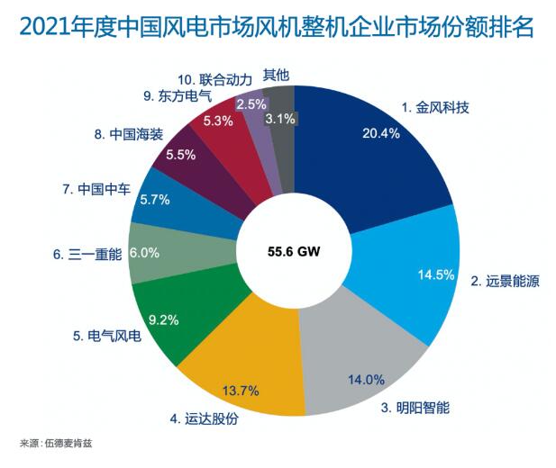 國(guó)際能源網(wǎng)/風(fēng)電頭條(微信號(hào):wind-2005s)獲悉,4月28日, 伍德麥肯茲WoodMac發(fā)布《2021年度中國(guó)風(fēng)電市場(chǎng)風(fēng)機(jī)整機(jī)企業(yè)市場(chǎng)份額排名》。數(shù)據(jù)顯示,受碳中和政策的持續(xù)激勵(lì)及海上風(fēng)電市場(chǎng)強(qiáng)勁增長(zhǎng)的推動(dòng),2021年中國(guó)風(fēng)電市場(chǎng)新增吊裝容量達(dá)到55.6GW。