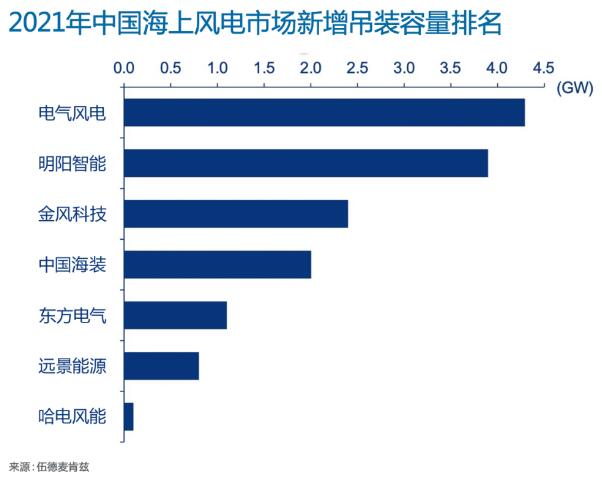 海上風(fēng)電新增裝機(jī)排名前三位的風(fēng)電整機(jī)商分別為電氣風(fēng)電(4.3GW)、明陽(yáng)智能(3.9GW)和金風(fēng)科技(2.4GW),其共同鎖定72%的海上風(fēng)電市場(chǎng)份額。