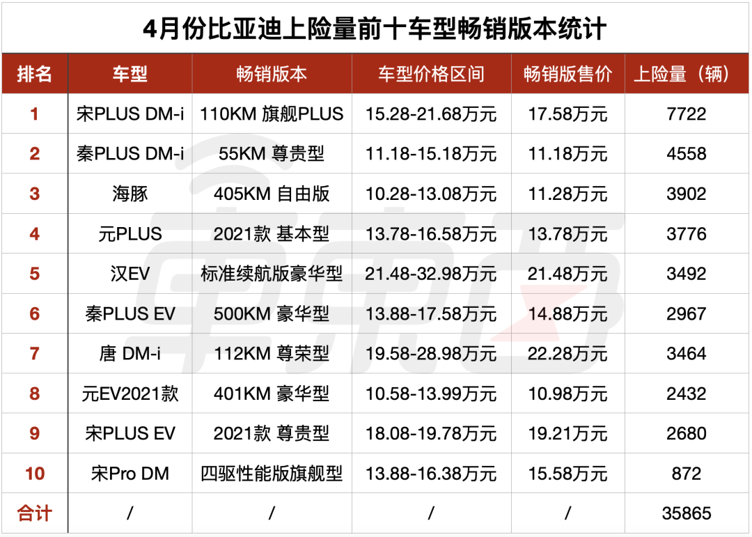 ▲比亞迪4月份上險量前十個車型暢銷版本情況