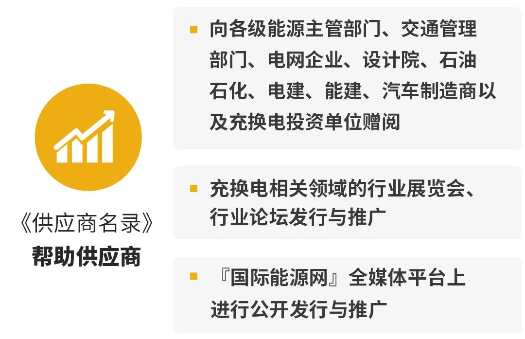 屆時,編印成冊的《供應商名錄》將向各級能源主管部門、交通管理部門、電網企業、設計院、石油石化、電建、能建、汽車制造商以及充換電投資單位贈閱,并在充換電相關領域的行業展覽會、行業論壇、以及『國際能源網』全媒體平臺上進行公開發行與推廣。申報有關具體事項如下: