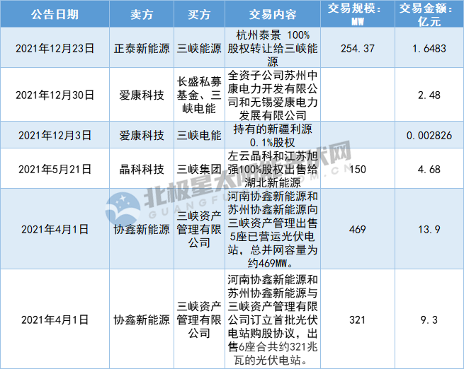 除了自主開發之外,三峽集團也在陸續收購優質電站資產,據北極星太陽能光伏網統計,2021年三峽已收購了超1GW的光伏電站,交易對象包括正泰、愛康、協鑫新能源、晶科等企業。