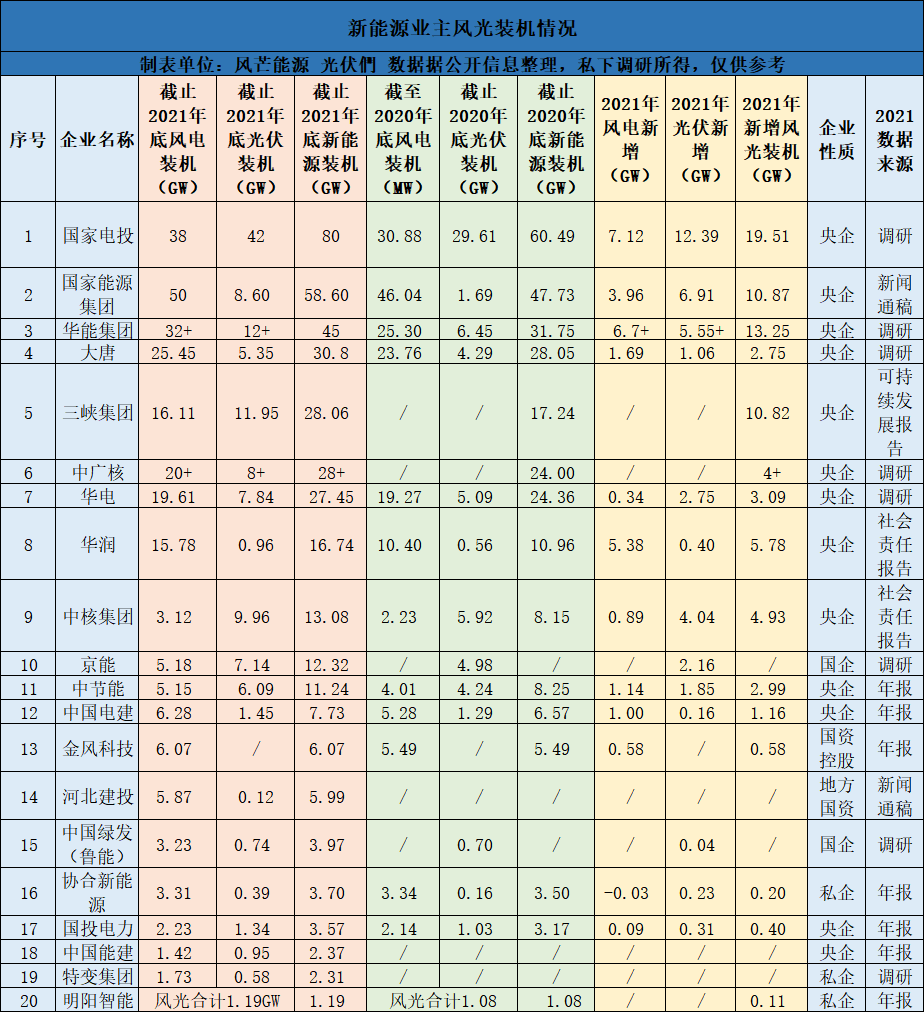 風芒能源、光伏們根據2021年新能源企業陸續公布的年報、社會責任報告、新聞披露以及采訪調研等,統計了20家業主截至2021年底風光電站持有量。