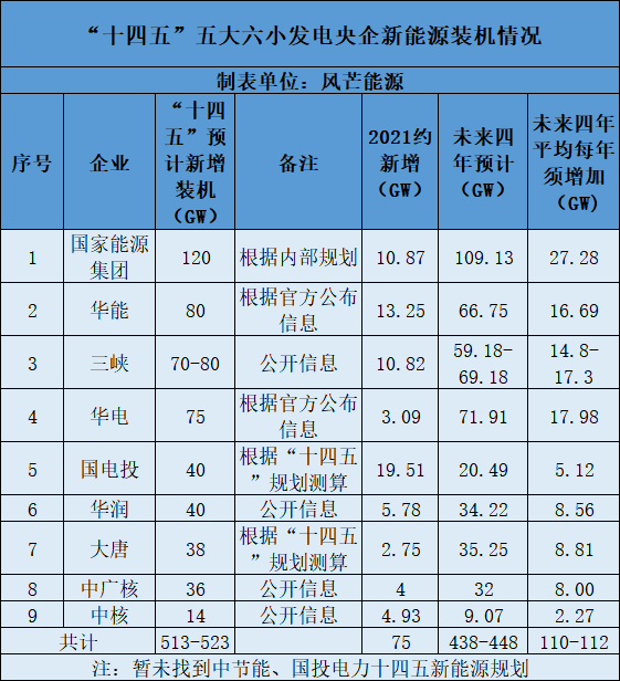 此前,五大六小發電央企等曾不同形式透露過集團“十四五”期間新能源裝機規劃。