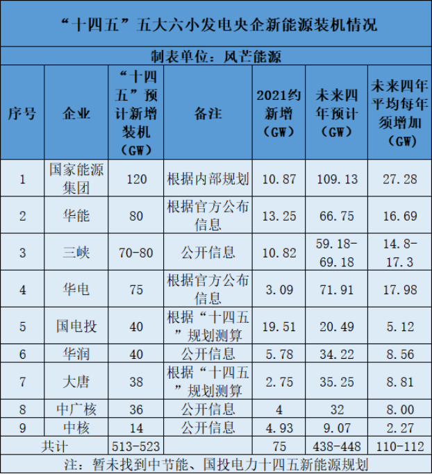 根據(jù)風(fēng)芒能源整理的2021年風(fēng)光業(yè)主裝機(jī)情況分析,五大發(fā)電集團(tuán)“十四五”共規(guī)劃新增新能源353GW。2021年合計(jì)約新增49.47GW。距離“十四五”目標(biāo)還有303.53GW,未來(lái)四年五大發(fā)電集團(tuán)平均每年共需增加新能源裝機(jī)約75.88GW。