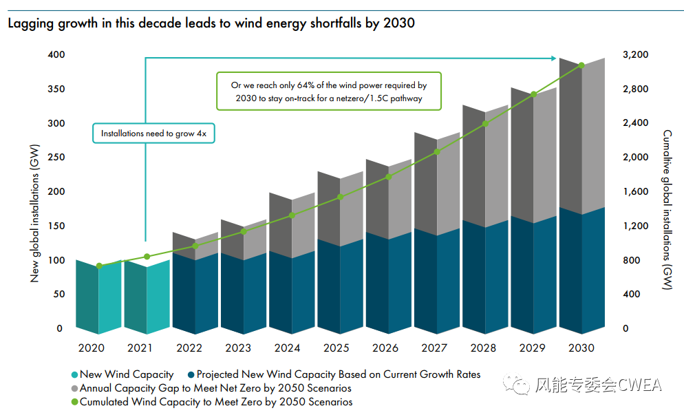 不過,這種風電裝機速度其實可以更高。根據GWEC預測,盡管風電裝機正處在上升通道中,但增長的深度和廣度依然不足以實現全球能源綠色轉型目標所預期——到2050年將全球氣溫上升限制在高于工業化前水平1.5°C。