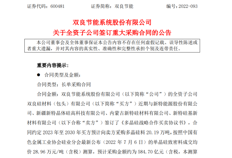 7月12日,雙良節能(SH:600481)發布公告,公司全資子公司雙良硅材料(包頭)有限公司近期與新特能源(HK:01799)及其三家子公司簽訂了《多晶硅戰略合作買賣協議書》,合同約定2023 -2030年間,雙良節能預計向新特能源采購多晶硅料20.19萬噸,預計采購金額約為584.70億元(含稅,本測算價格不構成價格承諾)。